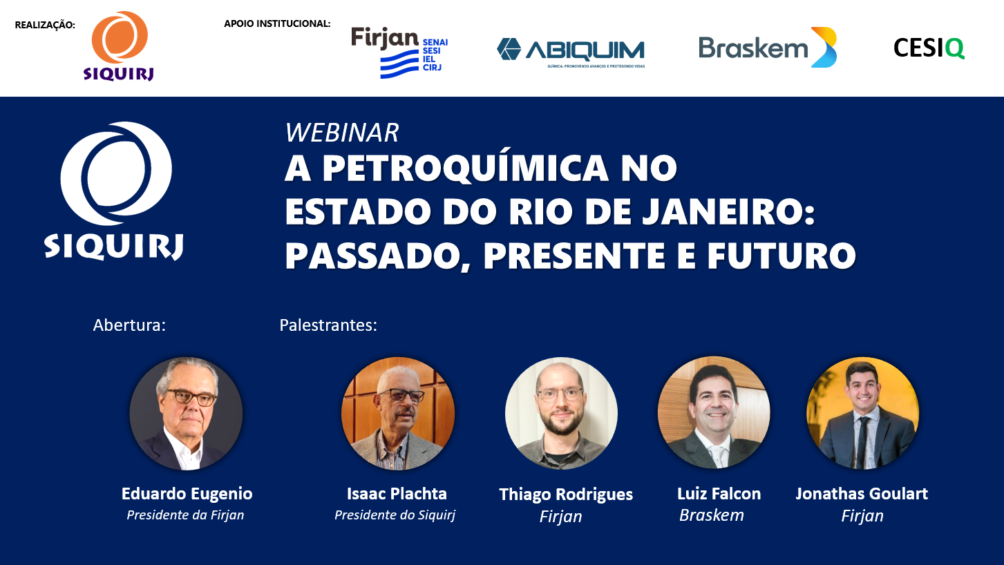 No dia 23 de novembro, o Siquirj, com o apoio institucional das entidades: Firjan, Abiquim, Braskem e CESIQ, realizou a webinar gratuita: “A Petroquímica no Estado do Rio de Janeiro: passado, presente e futuro”. O evento contou com a presença de Eduardo Eugenio Gouvêa Vieira, presidente da Firjan; Isaac Plachta, presidente do Siquirj; Thiago Valejo Rodrigues, Gerente de Projetos de Óleo, Gás e Naval da Firjan; Luiz Alberto Falcon, Líder de Plataforma de Reciclagem da Braskem e Jonathas Goulart, Economista-chefe da Firjan.